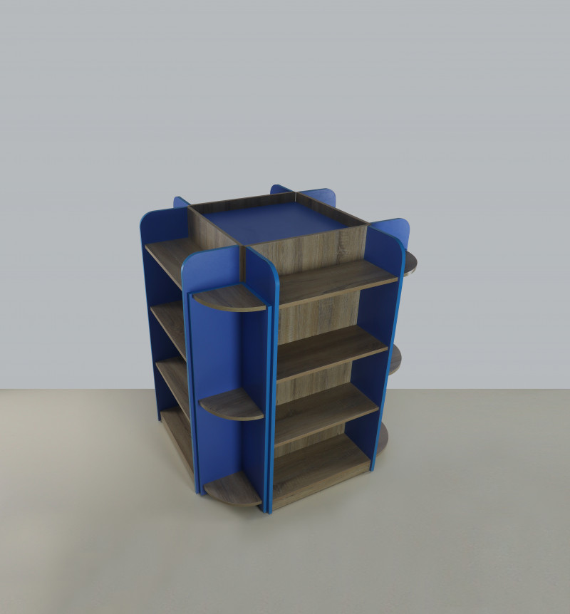 مكتبة اربع اتجاهات مصنعة من خشب mdf مغطى بطبقة من الميلامين 17 ملم والحروف مغطاه بقشاط pvc بلون الستاند ومحمل على البند كل ما يلزم له العمل كاملا طبقا للمواصفات الفنية واصول الصناعة