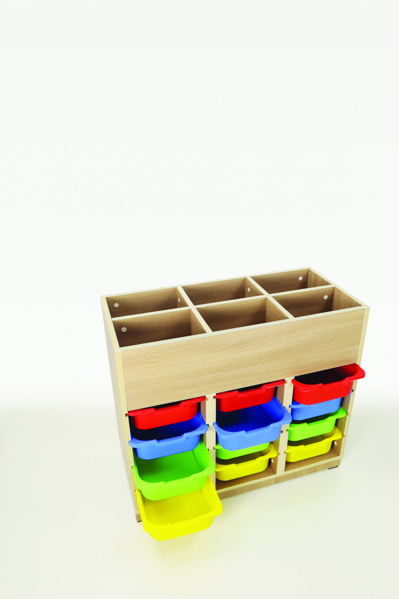 وحدة ذات اغراض متعددة لتخزين ادوات الرسم والالوان عبارة عن 6 فتحات بالاعلى و 9 علب تخزين بالاسفل مصنعة من خشب mdf مغطى بطبقة من الميلامين 17 مم والحروف مغطاه بقشاط pvc بلون الستاند ومحمل على البند كل ما يلزم له العمل كاملا طبقا للمواصفات الفنية واصول الصناعة